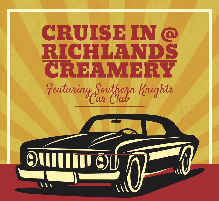 Come cruising with the Southern Knights Cruisers along with Richlands Creamery at the Richlands Creamery facility. The Creamery is on US Route 460W. The official address is 460 Cox Road, Blackstone VA 23824. It will start at 1:00pm and end by 4:00pm. Come on out and enjoy the beautiful countryside along with some great food and ice cream. There will be great looking cars/trucks to admire that will bring back fond memories. Food is available in the Creamery. There will be cruising music being played to the delight of many who grew up in this era. All are welcome regardless of what you drive. Additional information can be had by contacting Ricky Williams at uworime@comcast.net or call 804-691-3754 or Tracy Jones at 434-233-3014.